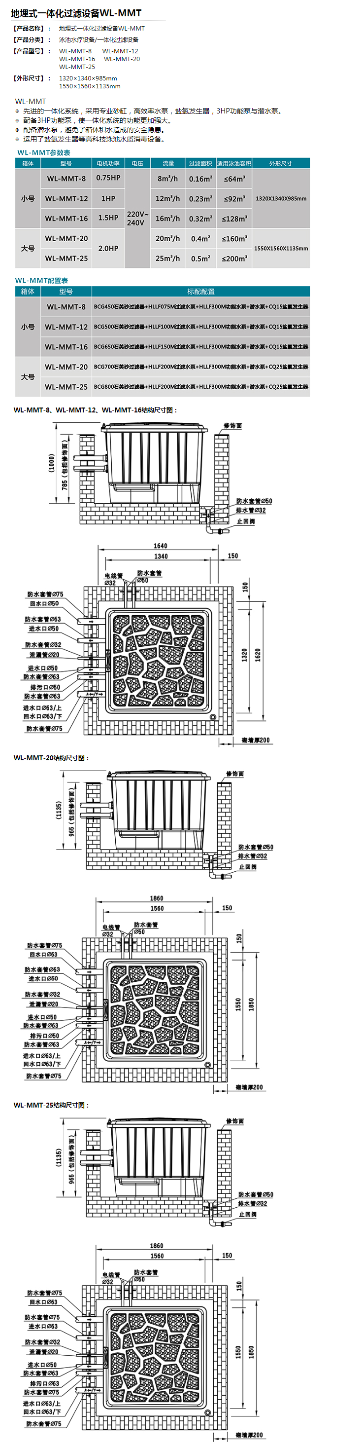 泳池循環(huán)過濾設(shè)備 有兩種可供挑選:一種是以泳池過濾砂缸、循環(huán)水泵、石英砂為主的傳統(tǒng)泳池過濾設(shè)備;一種是以泳池一體機(jī)為主的無機(jī)房一體泳池過濾設(shè)備,設(shè)備類型有壁掛式、地埋式、平嵌式、臺(tái)階式的?! 鹘y(tǒng)砂缸 一體式 泳池消毒設(shè)備 有許多品種可供挑選:投藥計(jì)量泵、投藥器、泳池消毒藥劑、投藥桶、臭氧發(fā)生器、鹽氯機(jī)、銅銀離子發(fā)生器 水質(zhì)監(jiān)測設(shè)備 水質(zhì)監(jiān)控儀、驗(yàn)水合 水下照明設(shè)備 泳池水