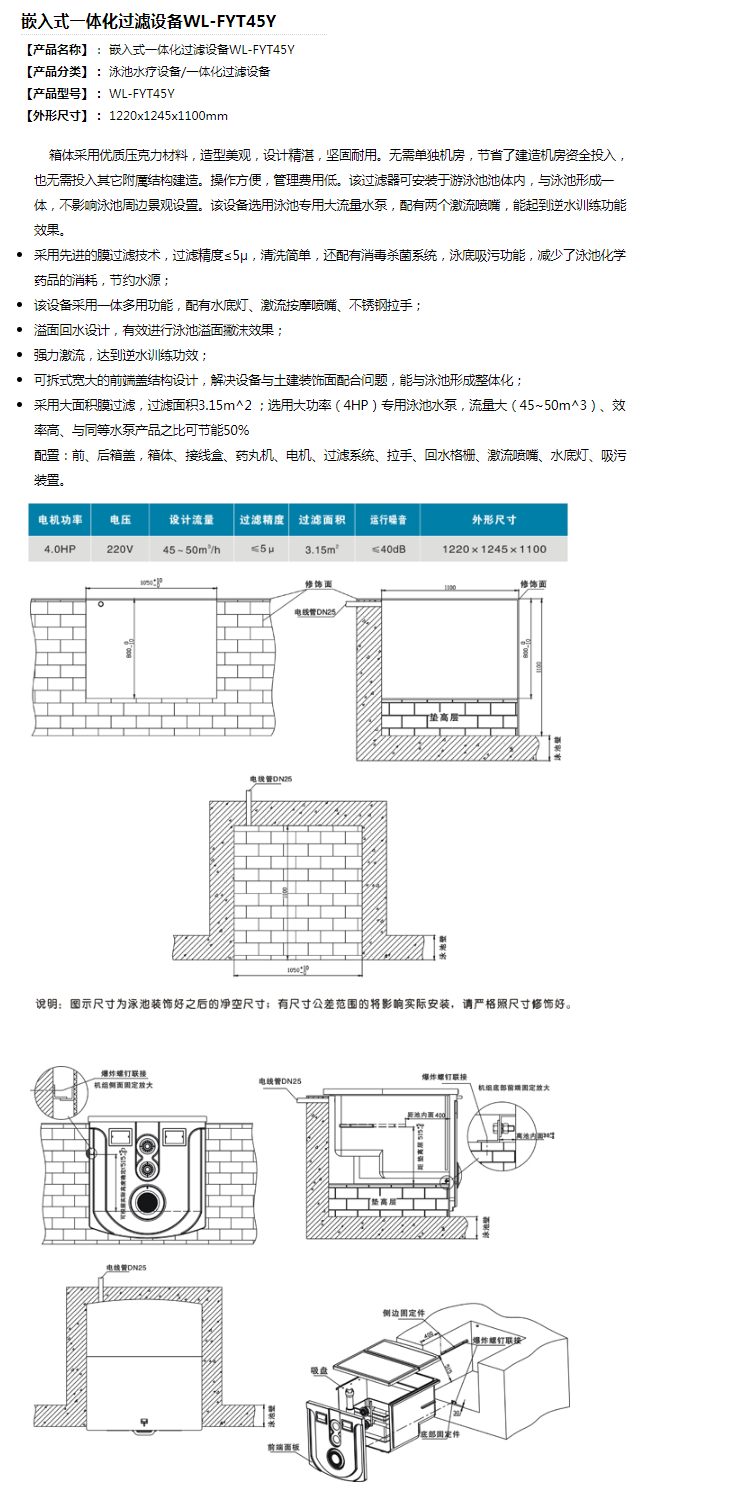 泳池循環(huán)過(guò)濾設(shè)備 有兩種可供挑選:一種是以泳池過(guò)濾砂缸、循環(huán)水泵、石英砂為主的傳統(tǒng)泳池過(guò)濾設(shè)備;一種是以泳池一體機(jī)為主的無(wú)機(jī)房一體泳池過(guò)濾設(shè)備,設(shè)備類(lèi)型有壁掛式、地埋式、平嵌式、臺(tái)階式的?! 鹘y(tǒng)砂缸 一體式 泳池消毒設(shè)備 有許多品種可供挑選:投藥計(jì)量泵、投藥器、泳池消毒藥劑、投藥桶、臭氧發(fā)生器、鹽氯機(jī)、銅銀離子發(fā)生器 水質(zhì)監(jiān)測(cè)設(shè)備 水質(zhì)監(jiān)控儀、驗(yàn)水合 水下照明設(shè)備 泳池水