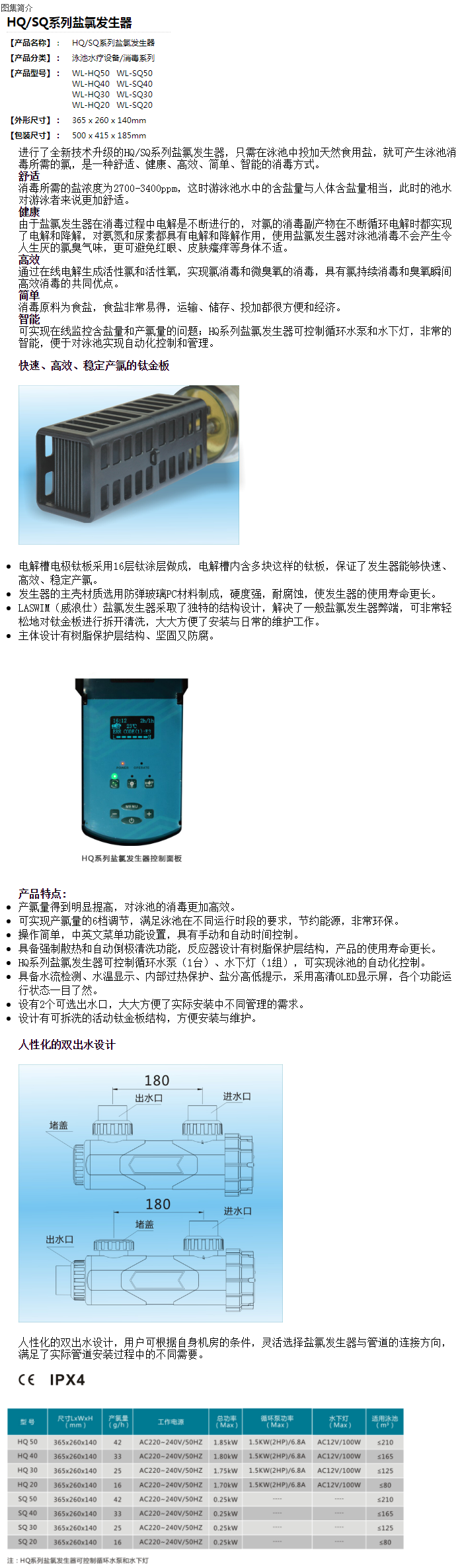 泳池循環(huán)過濾設(shè)備 有兩種可供挑選:一種是以泳池過濾砂缸、循環(huán)水泵、石英砂為主的傳統(tǒng)泳池過濾設(shè)備;一種是以泳池一體機(jī)為主的無(wú)機(jī)房一體泳池過濾設(shè)備,設(shè)備類型有壁掛式、地埋式、平嵌式、臺(tái)階式的。 傳統(tǒng)砂缸 一體式 泳池消毒設(shè)備 有許多品種可供挑選:投藥計(jì)量泵、投藥器、泳池消毒藥劑、投藥桶、臭氧發(fā)生器、鹽氯機(jī)、銅銀離子發(fā)生器 水質(zhì)監(jiān)測(cè)設(shè)備 水質(zhì)監(jiān)控儀、驗(yàn)水合 水下照明設(shè)備 泳池水