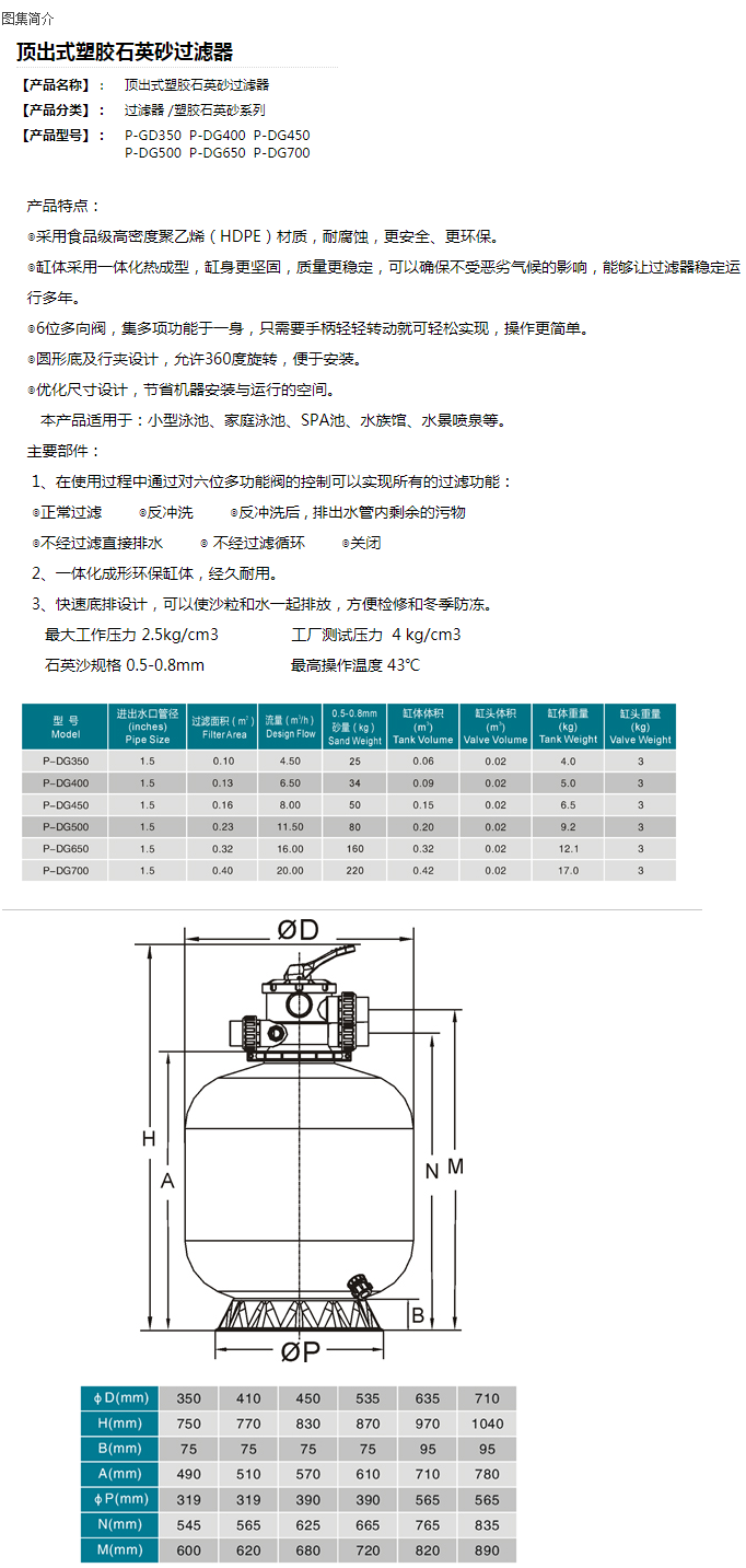 泳池循環(huán)過濾設(shè)備 有兩種可供挑選:一種是以泳池過濾砂缸、循環(huán)水泵、石英砂為主的傳統(tǒng)泳池過濾設(shè)備;一種是以泳池一體機(jī)為主的無機(jī)房一體泳池過濾設(shè)備,設(shè)備類型有壁掛式、地埋式、平嵌式、臺階式的?! 鹘y(tǒng)砂缸 一體式 泳池消毒設(shè)備 有許多品種可供挑選:投藥計量泵、投藥器、泳池消毒藥劑、投藥桶、臭氧發(fā)生器、鹽氯機(jī)、銅銀離子發(fā)生器 水質(zhì)監(jiān)測設(shè)備 水質(zhì)監(jiān)控儀、驗水合 水下照明設(shè)備 泳池水